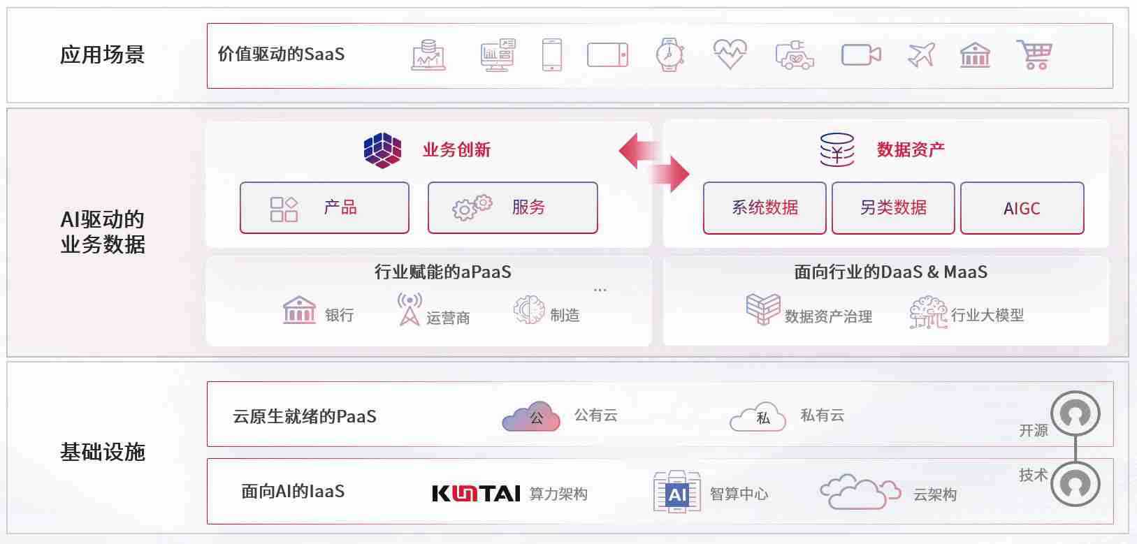 数字时代,,,围绕企业数字化转型的关键要素,,尊龙z6数码开创性的提出数云融合战略和技术体系框架,,,着力在云原生、、、、数字原生、、AI原生和信创产业上架构产品和服务能力,,,,为处在不同数字化转型阶段的快消零售、、、、汽车、、、金融、、、、医疗、、政企、、教育、、运营商等行业客户提供泛在的敏捷IT能力和融合的数据驱动能力,,构建跨界融合创新的数字业务场景和新业务模式,,,助力企业级客户建立面向未来的核心能力和竞争优势,,,全面推动社会的数字化、、、、智能化转型升级。。