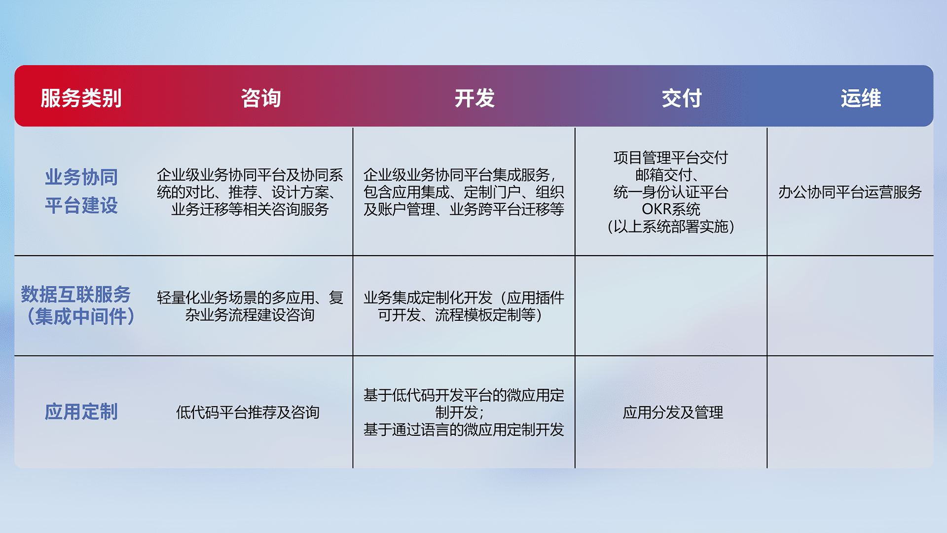 针对钉钉、、企微、、IDaas等平台级产品提供产品的规划、、、、方案、、、、交付、、定制化开发等服务,,,实现如统一协同办公、、、智能客户服务、、混合会议管理、、智能数据查询、、、、等业务场景,,实现数字化转型。。。